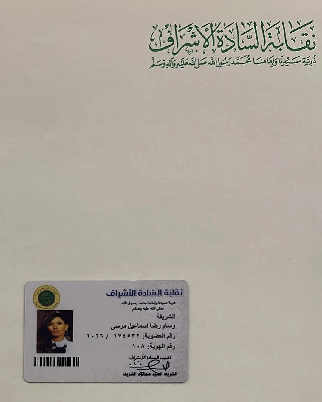وكشفت الفنانة من خلال الصور عن شهادة نسب رسمية تُثبت انتماءها وانتماء أبنائها إلى الأشراف من نسل النبي محمد ﷺ، مؤكدة أن هذه الوثائق موجودة لدى عائلتها منذ سنوات طويلة.