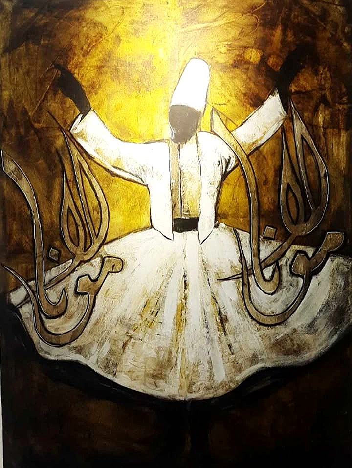 كما يتجسد في اللوحات دوران رمزي للمولوية، باعتباره ترجمة جسدية روحية لفكرة أن الكون بأسره يدور حول الحق. فالرقص الصوفي هنا ليس مجرد حركة، بل تجسيد لعلاقة الإنسان بالكون، حيث يبدو الراقصون ككواكب تدور في فلك الشمس، في انسجام كوني يفيض روحانية.