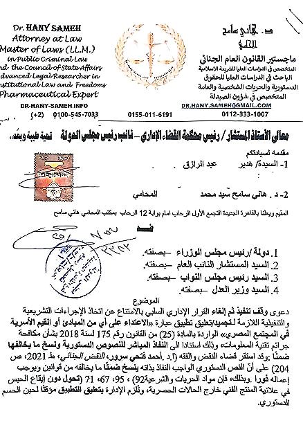 أطراف الدعوى: هدير عبد الرازق (عريضة)، رئيس مجلس الوزراء، النائب العام، رئيس مجلس النواب، وزير العدل.