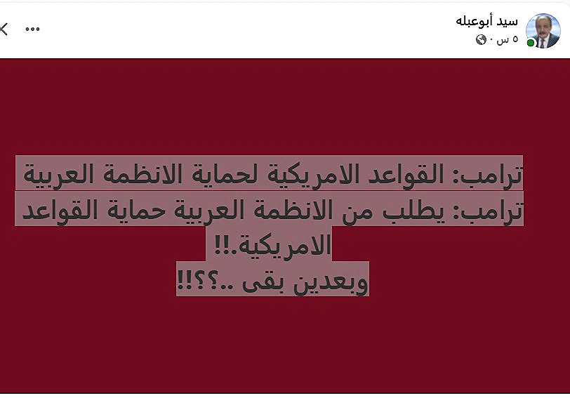 أثارت تصريحات للرئيس الأمريكي دونالد ترامب موجة واسعة من الجدل على مواقع التواصل الاجتماعي في مصر وعدد من الدول العربية، بعدما تحدث عن القواعد العسكرية الأمريكية في المنطقة ودورها في حماية الأنظمة العربية، مطالبًا تلك الأنظمة – بحسب ما تداوله مستخدمو الإنترنت – بتحمل مسؤولية حماية هذه القواعد.