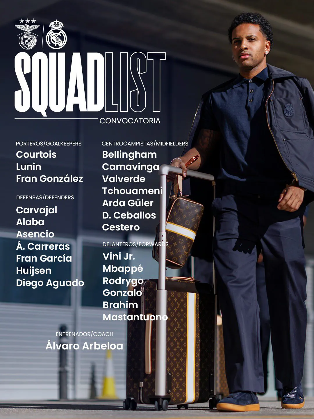 تغيب 4 مدافعين رئيسيين، مما يضطر أربيلوا للاعتماد على كارباخال، ألابا، أسينسيو، كاريراس، فران جارسيا، هاوسن، وأجوادو. الحراس: كورتوا، لونين، جونزاليز. الوسط: بيلينغهام، كامافينجا، فالفيردي، تشواميني، جولر، سيبايوس، سيستيرو. الهجوم: فينيسيوس، مبابي، رودريجو، جارسيا، دياز، ماستانتونو. تحليليًا، الدفاع الاحتياطي يعرض الريال للمخاطر، لكن الهجوم القوي يكفي لتعويض ذلك أمام بنفيكا الضعيف.