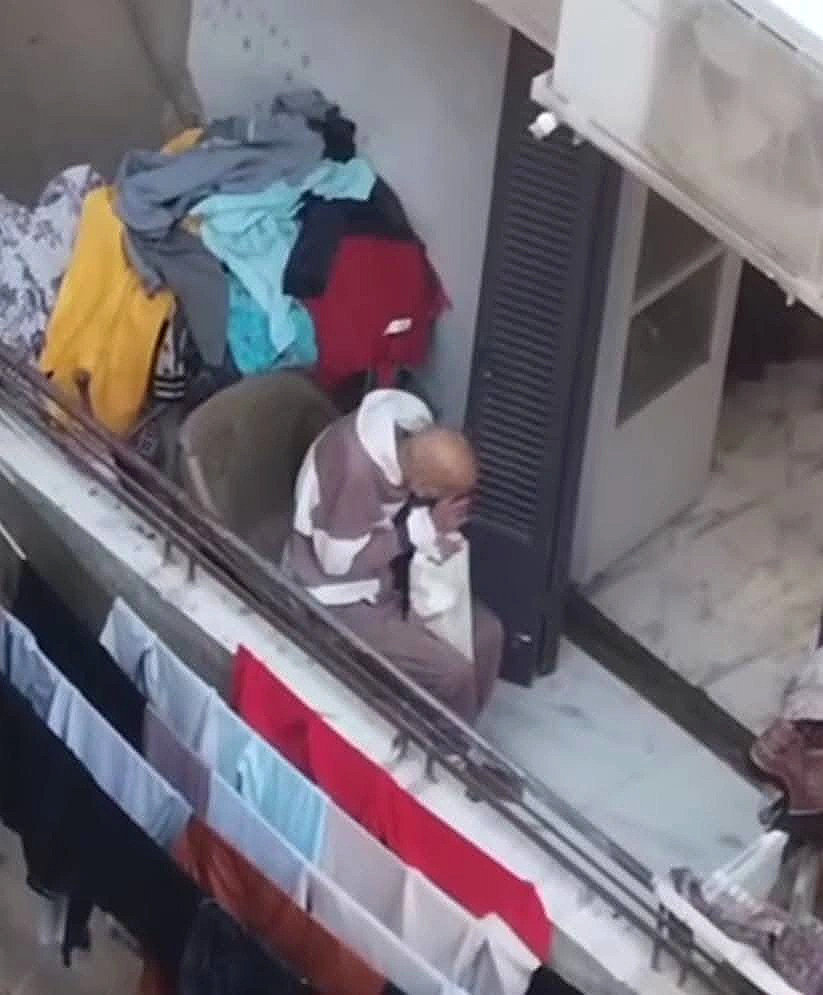 المشهد الذي صدم الجميع كان ظهور الرجل المسن مقيدًا بالحبال من يديه وقدميه داخل شرفة الدار، في محاولة – بحسب القائمين على المكان – للسيطرة على حركته بسبب معاناته من الزهايمر وفرط الحركة.