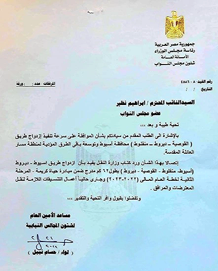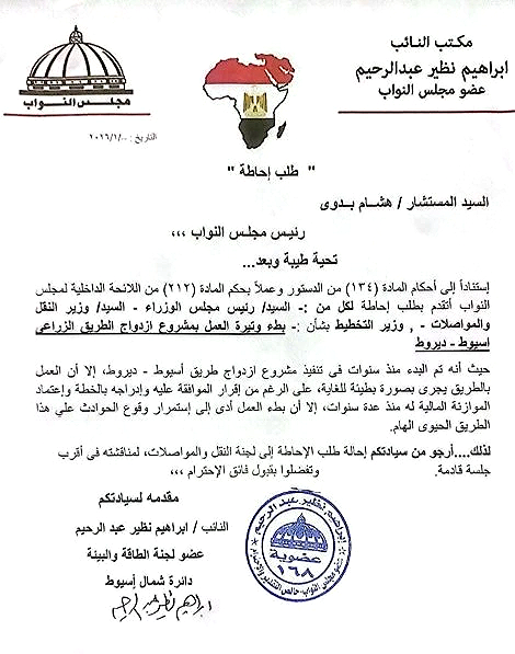 تقدم النائب إبراهيم نظير عضو مجلس النواب بطلب إحاطة عاجل إلى كل من رئيس مجلس الوزراء، ووزير النقل والمواصلات، ووزير التخطيط، وذلك بشأن بطء وتيرة العمل في مشروع ازدواج الطريق الزراعي أسيوط – ديروط، أحد أهم الطرق الحيوية بمحافظة أسيوط.