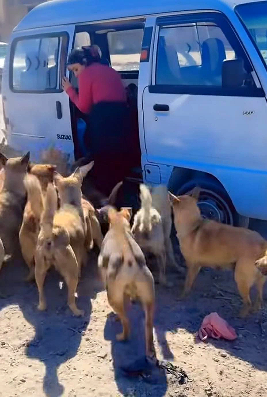 تُظهر الصور المنشورة فتاة تقف بجوار سيارة بيضاء، بينما تلتف حولها مجموعة كبيرة من الكلاب في الشارع، في مشهد يعكس علاقة ألفة بينها وبين هذه الحيوانات. وعلى الرغم من أن المشهد قد يبدو مخيفًا للبعض بسبب كثرة الكلاب، فإن الفتاة بدت هادئة ومعتادة على التعامل معها، وكأنها تعرفها وتعرف أنها تنتظر الطعام والرعاية لا الأذى.