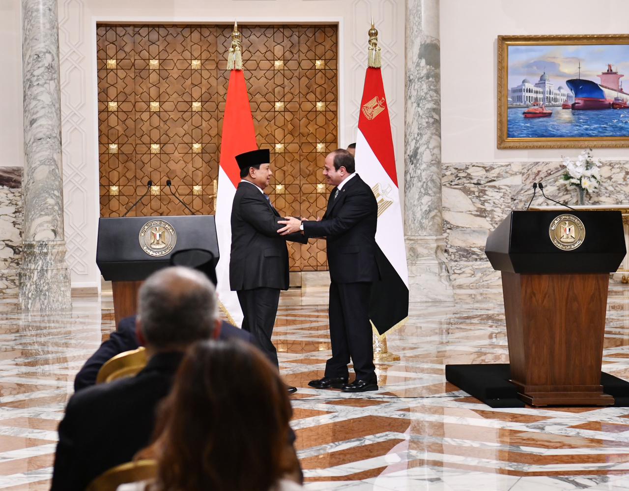 استقبل الرئيس عبد الفتاح السيسي، اليوم، رئيس جمهورية إندونيسيا برابوو سوبيانتو، الذي يقوم بزيارة رسمية إلى مصر، حيث عقد الرئيسان جلسة مباحثات ثنائية أعقبها جلسة موسعة حضرها من الجانب المصري الدكتور بدر عبد العاطي، وزير الخارجية والهجرة وشؤون المصريين بالخارج والمهندس حسن الخطيب وزير الاستثمار والتجارة الخارجية.