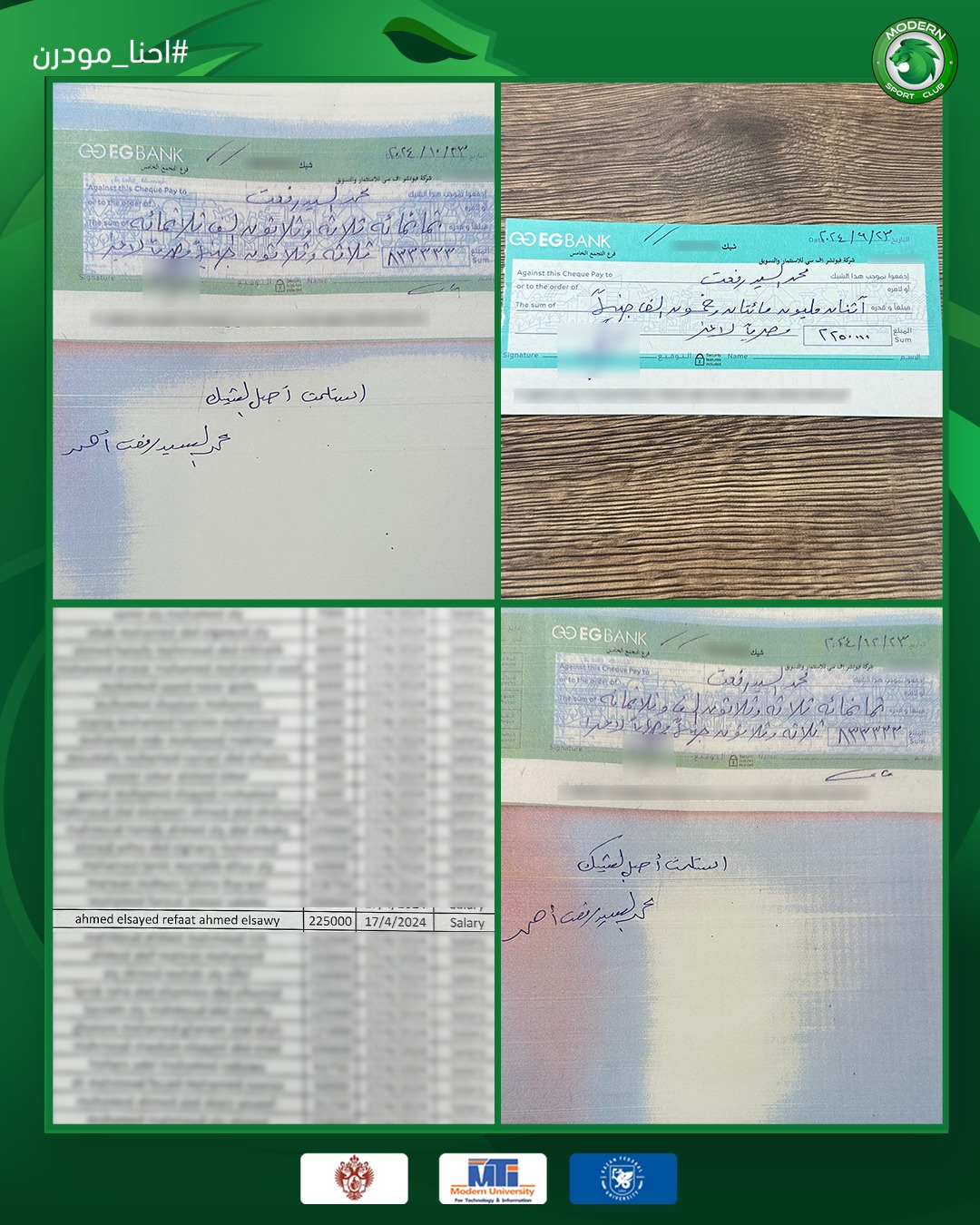 “أولاً:- يؤكد نادي مودرن سبورت على إلتزامه الكامل بأداء كافة مستحقات ابن النادى المرحوم/ أحمد رفعت لورثته الشرعيين وذلك طبقاً للتعاقد المبرم بين النادي واللاعب، ويؤكد كذلك على أداء تلك المستحقات وفقاً للمواعيد المحددة بعقد اللاعب حتى نهاية مدته موسم 2025/2026”.