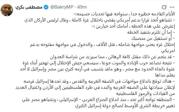 وكتب «بكري» في تدوينة عبر صفحته الرسمية بمنصة «إكس»، صباح اليوم الثلاثاء: «نتنياهو اتخذ قرارًا بدعم أمريكي يقضي باحتلال غزة كاملة، وقال لرئيس الأركان الذي اعترض على هذه الخطة، أمامك أحد خيارين: إما أن تلتزم بتنفيذ الخطة، أو تستقيل من منصبك».