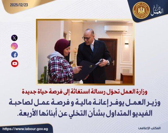 ورحّب الوزير، خلال اللقاء، بـ «أميرة» فور وصولها إلى مقر الوزارة، وسلمها عقد عمل إلى جانب إعانة مالية عاجلة لمساعدتها على مواجهة أعباء المعيشة ورعاية أبنائها، في خطوة تعكس التزام الوزارة بالمسؤولية الاجتماعية والإنسانية.
