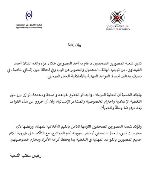 "تدين ما قام به أحد المصورين خلال عزاء والدة أحمد الفيشاوي، من تصوير عن قرب باستخدام الهاتف المحمول، في لحظة حزينة خاصة، وهو تصرف يخالف أبسط القواعد المهنية والأخلاقية للعمل الصحفي."
